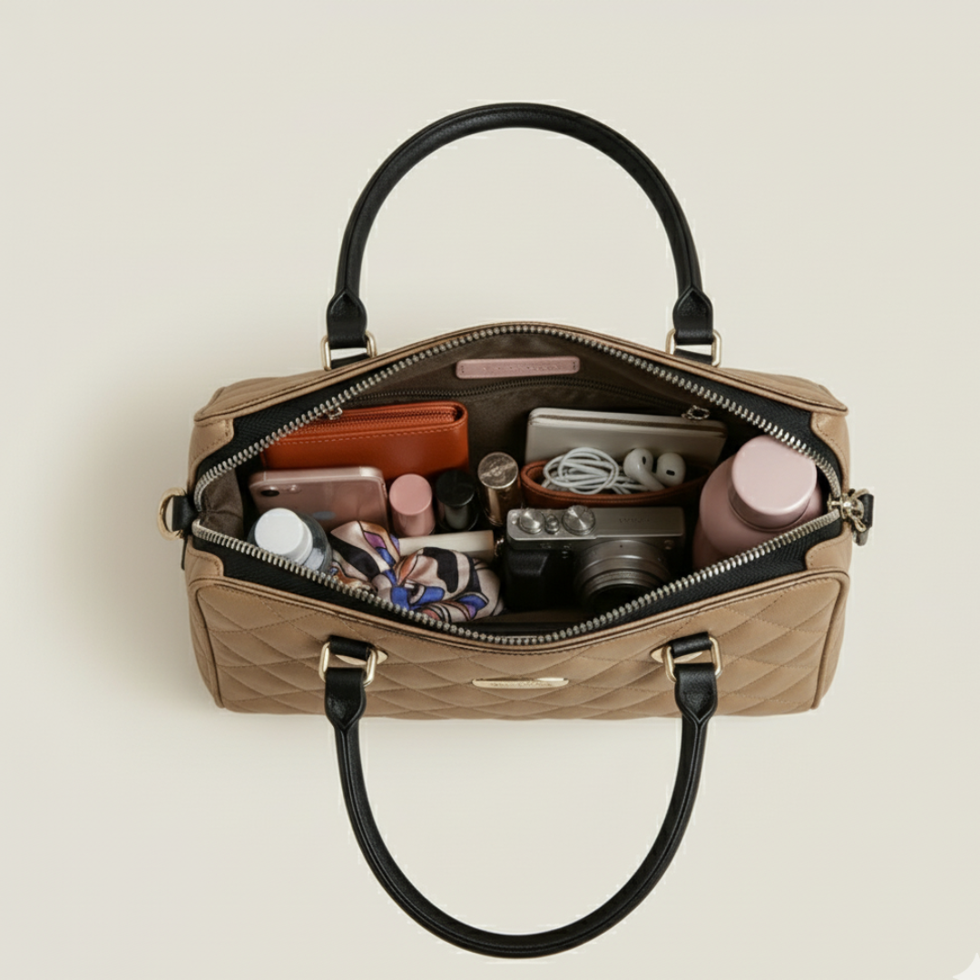 The Aurora Quilta Tote HandBag is a premium tan quilted handbag crafted for elegance, featuring golden hardware, durable handles, and versatile styling.