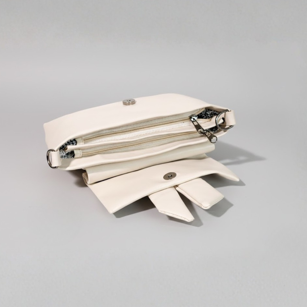 A premium beige crossbody bag featuring a statement bow design, spacious compartments, and durable PU leather—perfect for everyday outings, casual wear, and gifting.